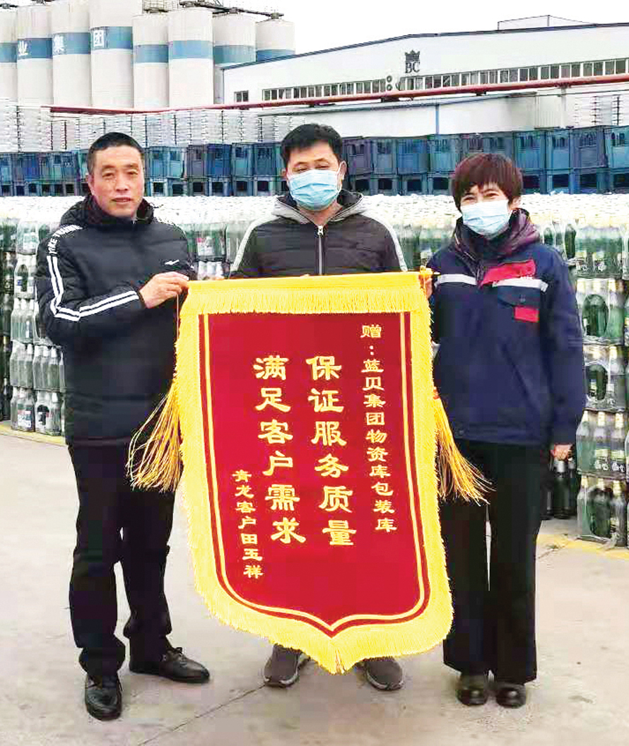 11月26日,一面红红的锦旗出现在仓储部包装库,这面锦旗是青龙县返瓶拉酒司机田玉祥师傅送来的,上写“保证服务质量、满足客户需求”12个烫金的大字。这是客户对包装库总体服务的最好褒奖,这不仅是来自客户的充分肯定,更是蓝贝人全心全意为客户服务的责任和使命。